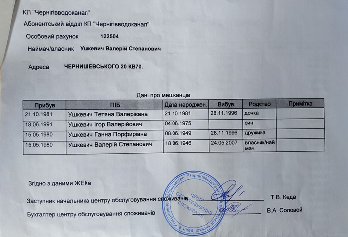 Суть справи полягає в наступному. 3 1980 до 2007 року батько Ушкевича Ігоря Валерійовича - Ушкевич Валерій Степанович мешкав за вищезгаданою адресою і був відповідальним орендарем. А після грудня 1999 р. він став відповідальним власником. Виробник послуг водопостачання та водовідведення КП «Чернігіввводоканал» почав надавати свої послуги мешканцям багатоквартирних будинків та відкрив особові рахунки з травня 2003 року.