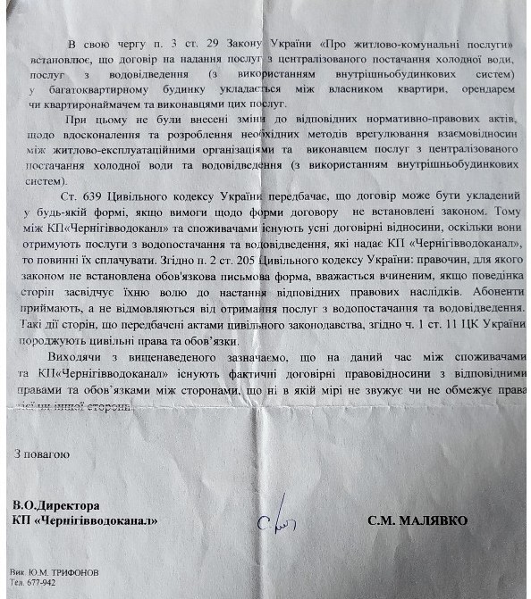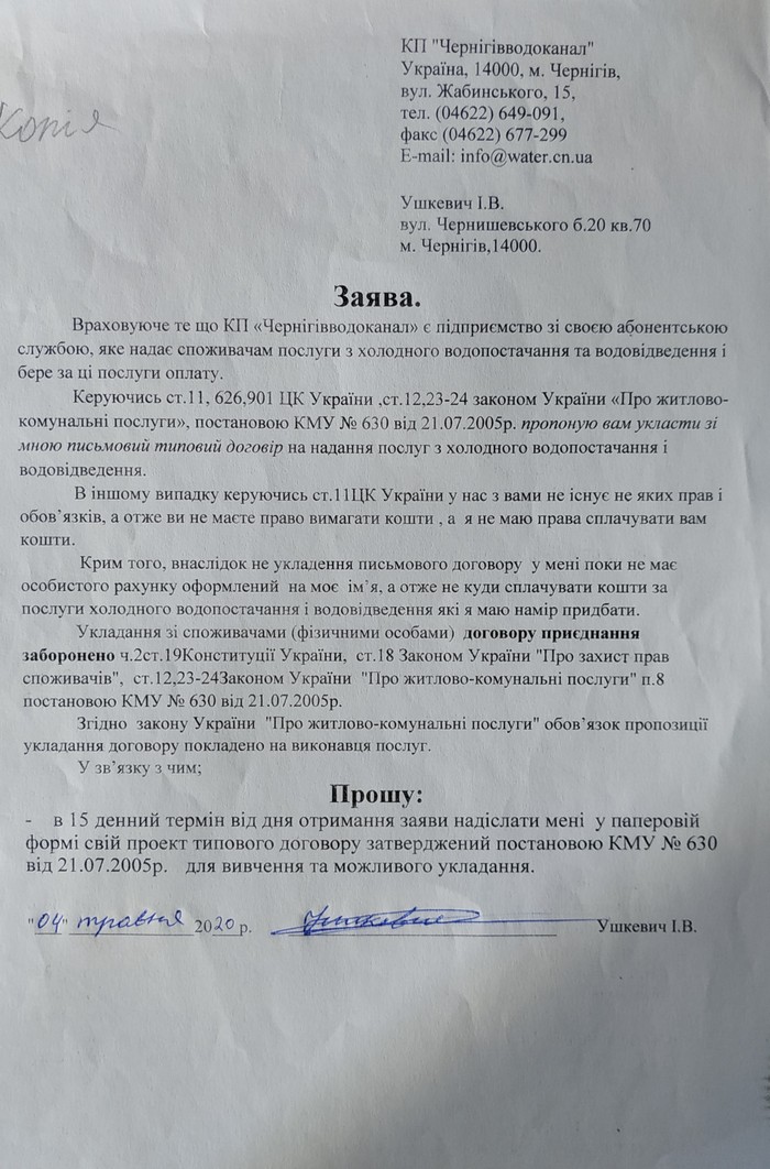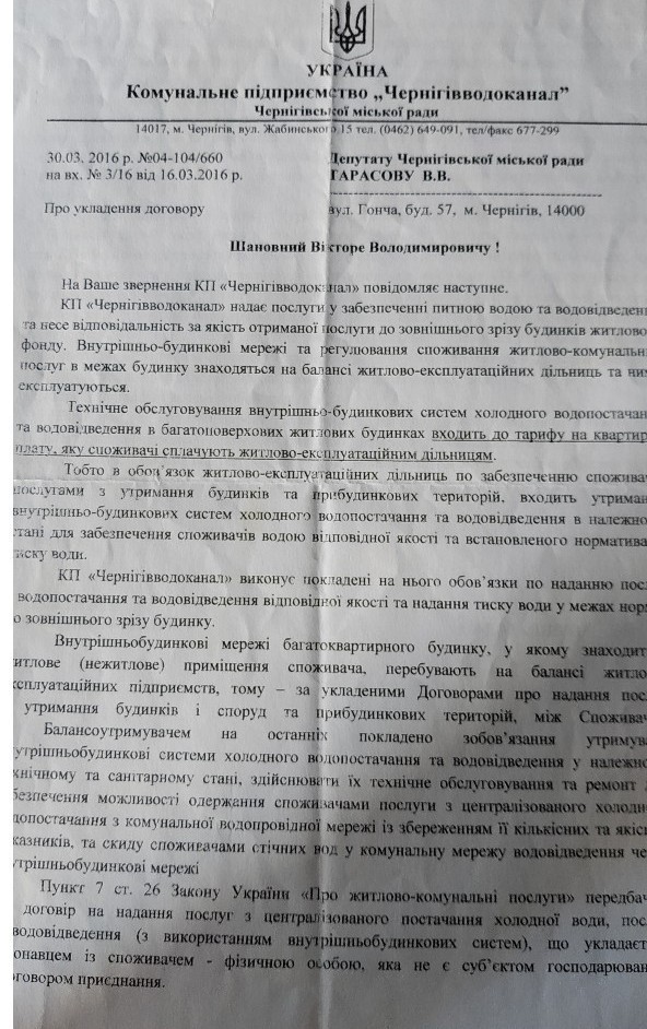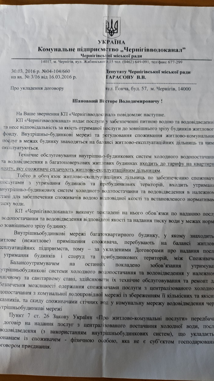 Стосовно необхідності заключення договору, я навіть звертався до депутата ЧМР Тарасова В..В., який в свою чергу - до в.о. директора КП «Чернігівводоканал» С.М. Малявко, але так нічого і не добився.