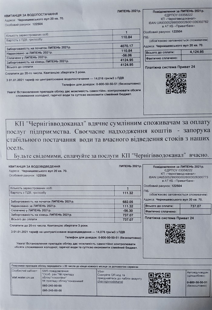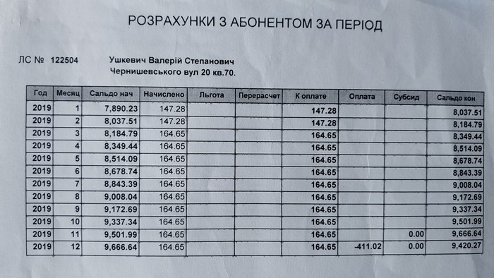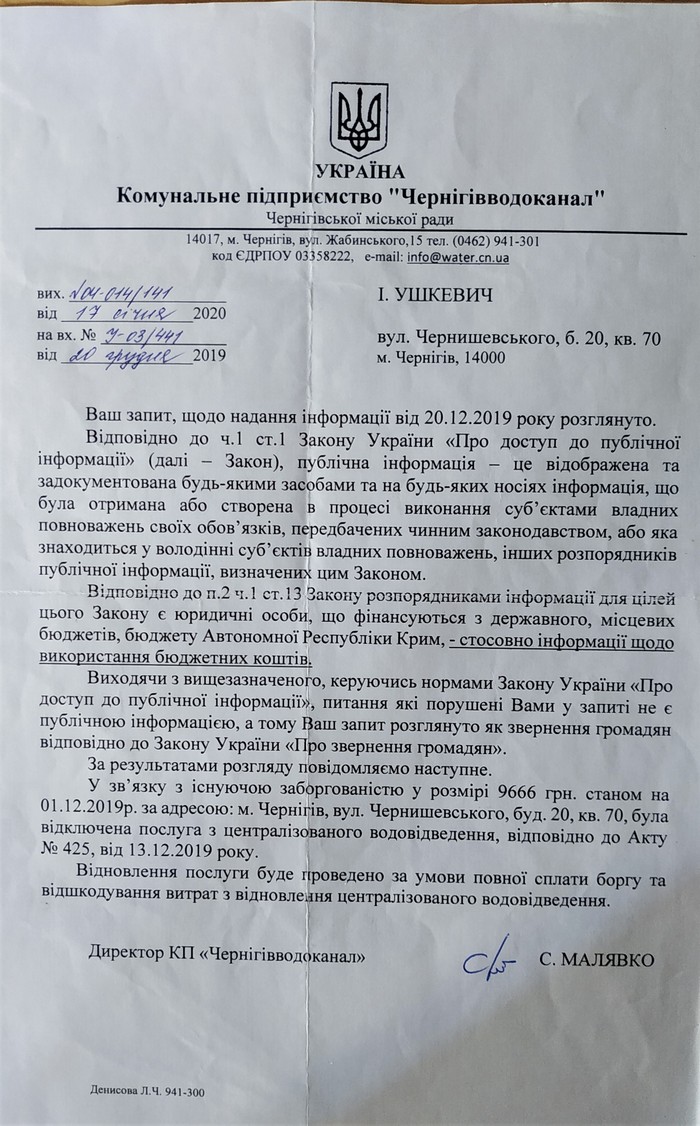 Внаслідок чого, станом на 13 грудня 2019 р. сума необґрунтованого боргу за особовим рахунком № 122504, оформленого на ім’я батька Ушкевича В.С. склала 9420,27 грн. Потім при подачі позову 23.01.2020 р. вона змінилася та склала 5312,75 грн., а після уточнення від 15.02.2021 р. склала 3780,78 грн. Але ж з цих причин, у січні 2020 року КП «Чернігівводоканал» припинило надання послуги з централізованого водовідведення, чим порушило рішення Верховної Ради припиняти/ зупиняти надання житлово-комунальних послуг громадянам України на період карантину.