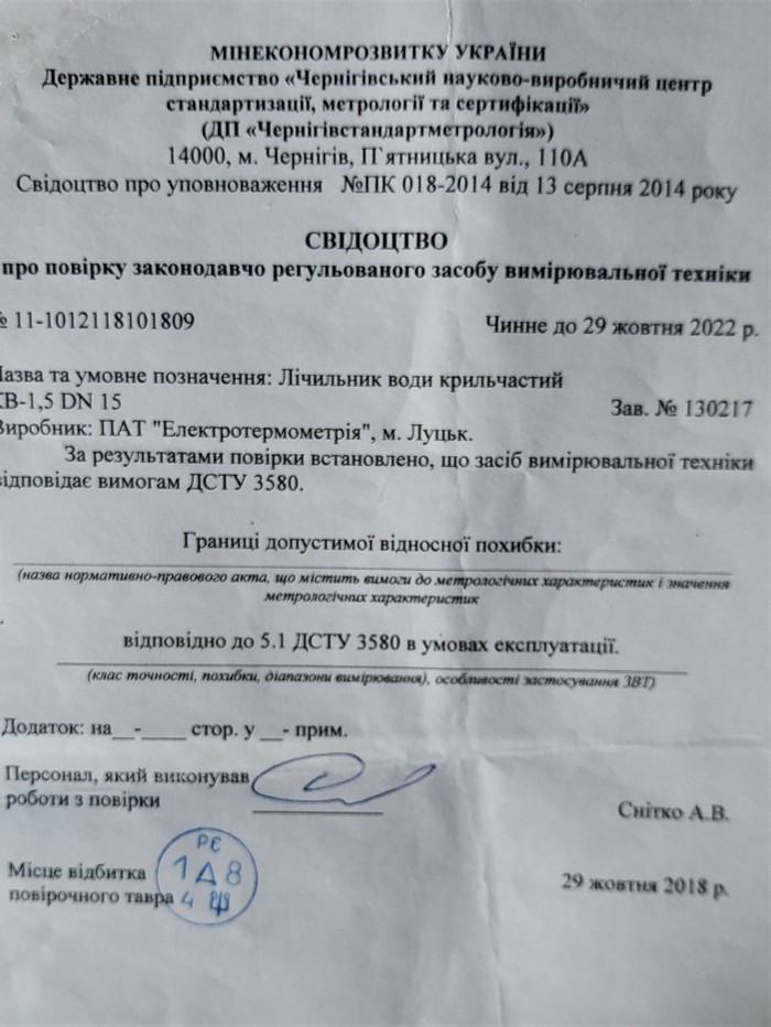 До речі, мною за власні кошти було проведено повірку лічильника води КВ-1,5 №130217 за власний рахунок, що підтверджується виданим свідоцтвом про повірку засобу вимірювальної техніки від 29.10.18 р. З часу встановлення по даний час лічильник у справному стані.