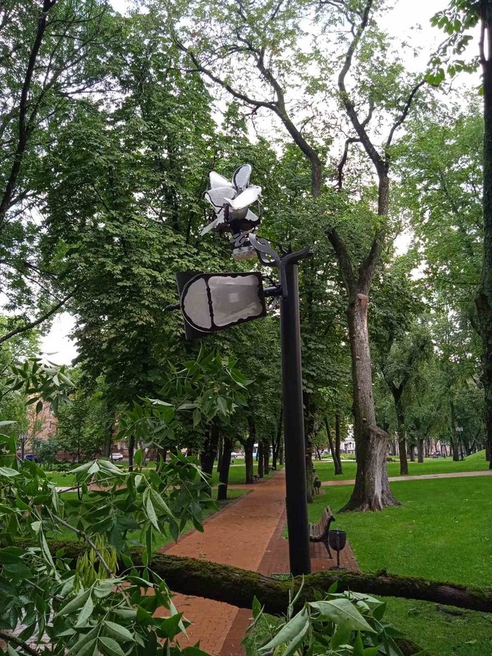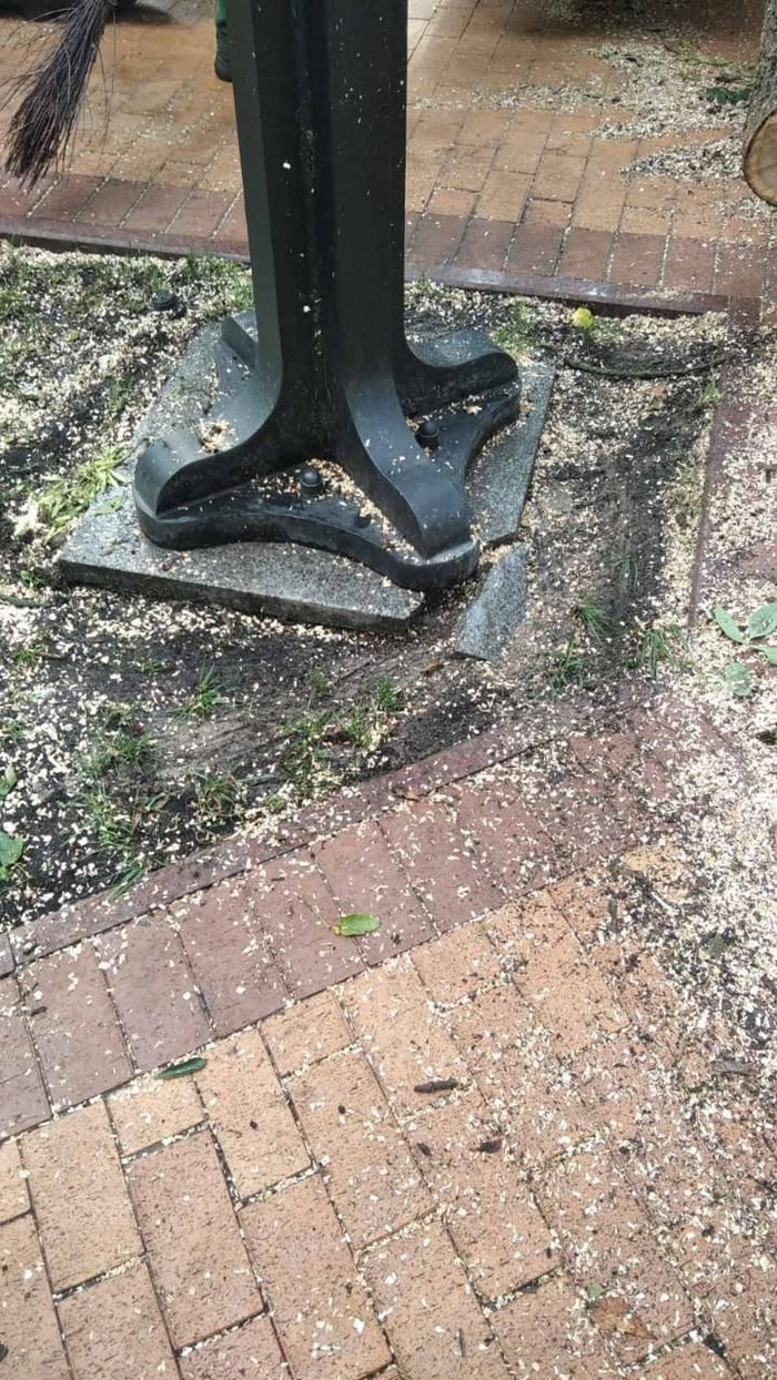 Під час падіння дерево зачепило лавочку і розтрощило ліхтар. В тому числі пошкоджено гранітну підставку під ліхтарем.