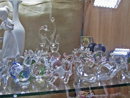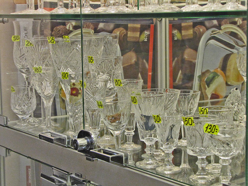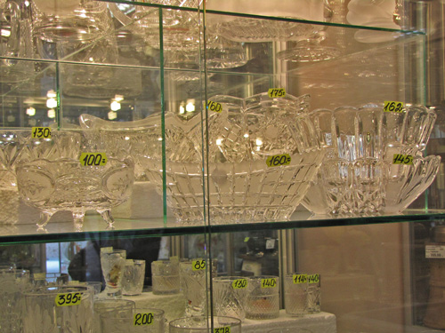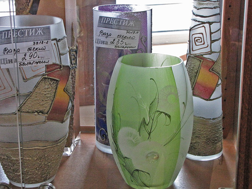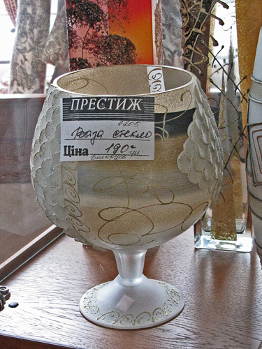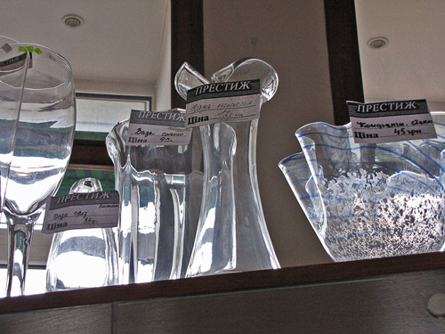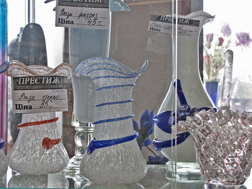 Магазин «Престиж», который недалеко от гостиницы «Градецкий», представил на своих полках стеклянные изделия из Беларуси, Польши, Болгарии. В магазине «Ромашка» по улице Щорса, ногу некуда поставить от обилия посуды, но Украинский производитель отсутствует. В магазине «Оптика» есть стекла для очков Украинского производства. Производитель – г. Измаил. В магазине «Триумф», симпатичная девушка показала сувенирные изделия из хрусталя (пирамиды, шарики, кристаллы) китайского изготовления. В магазине «Мир посуды» в широком ассортименте посуда из стекла и хрусталя. Хрусталь – российского производства, посуда в основном немецкого. В отделе магазина «Пятницкий», на полках великолепно смотрятся красочные стеклянные изделия, изготовленные в Италии и Франции.