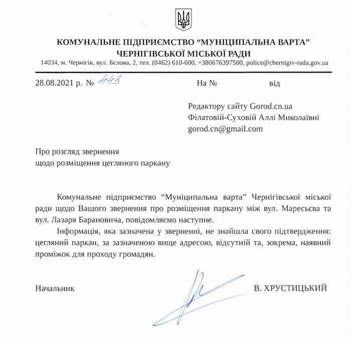Публікуємо нижче відповідь очільника Мунварти Чернігова Віталія Хрустицького, який, вочевидь, приходив на перевірку, коли зруйнували старий паркан, але не звели новий. Нам також не надали дані про те, хто саме виконував роботи при зведенні паркану, тож доведеться писати нове звернення, аби прояснити, на яких підставах будь-який мешканець Чернігова може звести огорожу на території міста та заборонити прохід по землі, яка належить чернігівській громаді.