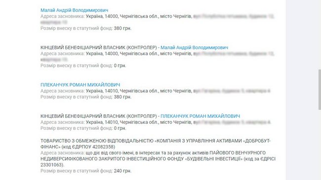 «Плеканчук та Малай вносять в статутний капітал по 38%. А ще 24% вносить ТОВ «Добробут фінанс». Зокрема в склад цього товариства входить пайовий венчурний інвестиційний фонд «Будівельні інвестиції». Керує цим фондом той самий Дмитро Федоров, який є радником міського голови, його адвокатом, ну і взагалі довіреною людиною», – говорить правозахисник Олександр Гашпар.