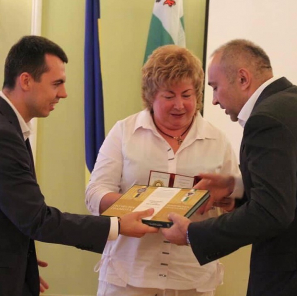 Голова обласної ради Олена Дмитренко вручає нагороду "головному патріоту" Чернігівщини Борису Приходьку