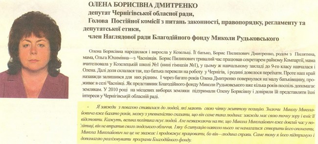 Втім, Олена Борисівна була й помічником нардепа Рудьковського, мала б допомагати йому виконувати й депутатські обіцянки: сільські дороги можуть стати кращими, головне – здоров’я, «піклувався» депутат про освітян і нові робочі місця, про ветеранів і дітей війни, про підтримку місцевого бізнесу, про релігію – та про що тільки не «піклувався». Де виконання гарних обіцянок, і де тепер сам обіцяльник? Нібито знову хоче в політику погратися – мабуть, не всі мільйони, «зароблені» на народних надрах, з нього «витрусили»? Чи не поспішає Олена Борисівна, прославляючи нового політичного кумира й благодійника?