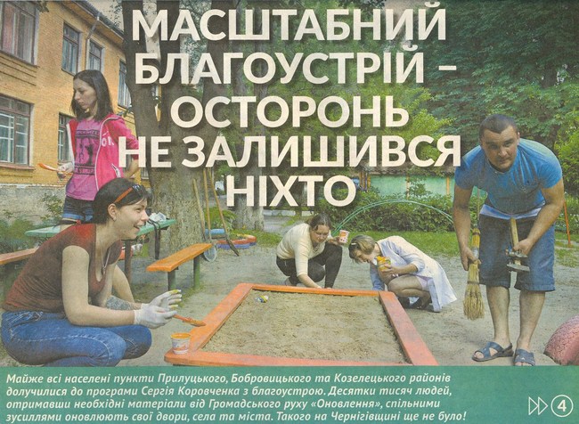 Після трирічного забуття раптом виринув на поверхню політичного життя Чернігівщини «десантник» з Криму Сергій Коровченко, який від команди Юлії Тимошенко балотувався в народні депутати по Козелецькому виборчому округу. Для піару створив громадський рух «Оновлення», мабуть, щоб не повторювати Благодійний фонд Рудьковського. Але суть агітації та ж: роздавали необхідні матеріали, щоб спільними зусиллями виборці оновлювали свої двори, соціальні об’єкти, взагалі села та міста, що проводилося й проводиться без Коровченкового «Оновлення». Але «благодійна скупка» голосів супроводжувалася політичними гаслами: «Влада зазіхає на землю українців», «Українців масово позбавляють фінансової підтримки», «Влада планує повісити черговий борг на нас, наших дітей та внуків» і т.д. Багато виборців клюнули на нову політичну брехню: перший попередній підрахунок голосів – Коровченко переміг, а потім він загадково програв судовий розгляд підрахунку голосів головному конкуренту Борису Приходьку. На цьому й завершилося «оновлення» сіл і міст 210-го виборчого округу, Коровченко кудись зник, і раптом опинився серед «Патріотів Чернігівщини». За які заслуги? За передвиборчі подачки для «суботників» чи за програш в суді конкуренту Приходьку? Тепер знову щось планує?