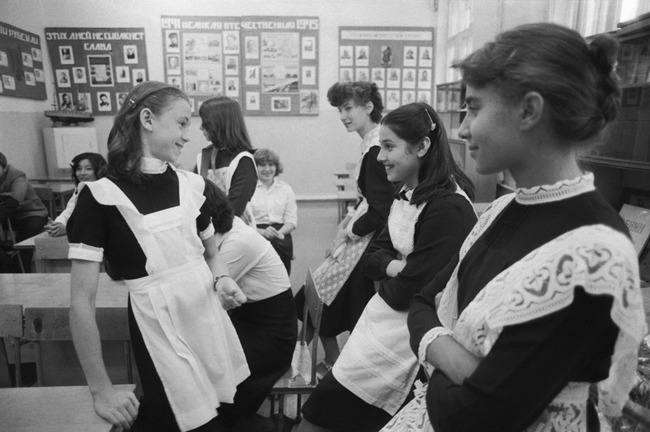 У 1975-му, я, першокласниця, отримала у спадок від котроїсь із старших сестер свою темно-синю шкільну форму. Всі мої однокласниці вже мали коричневі платтячка, і тоді, коли Вчитель мене хвалив за відмінне читання чи ще за щось, дівчата-однокласниці вже тоді нашіптували: «А вона не у формі в школу ходить!» Вчитель запевняв їх, що моя темно-синя сукня – теж форма, просто, такі були трішки раніше. А от якість наших формених платтячок була відмінною. Вони – ніби шинель у солдата: у спеку не жарко, бо вона вовняна, у мороз не холодно, бо… вона вовняна. Тільки трішки тонша за шинель…