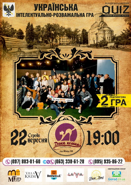 ЦІКАВО 22 вересня в середу в закладі "Дика кішка" відбудеться 2 рейтингова гра 2 сезону проєкту Національний QUIZ в м.Чернігів! Ще більше цікавих запитань, нові ідеї та натхнення, а також купа подарунків від спонсорів! Все це і не тільки чекає на вас наступної гри!