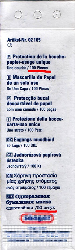 Наши постоянные читатели продолжают присылають на адрес редакции сайта интересные фотографии, связанные с жизнью нашего города. Интересные особенности перевода на пачке марлевых повязок: на всех языках написано, что масок в упаковке 100, а в русском переводе 50. На самом деле их там было 25. Размер пачки врядли позволил бы укомплектовать туда более 40.
