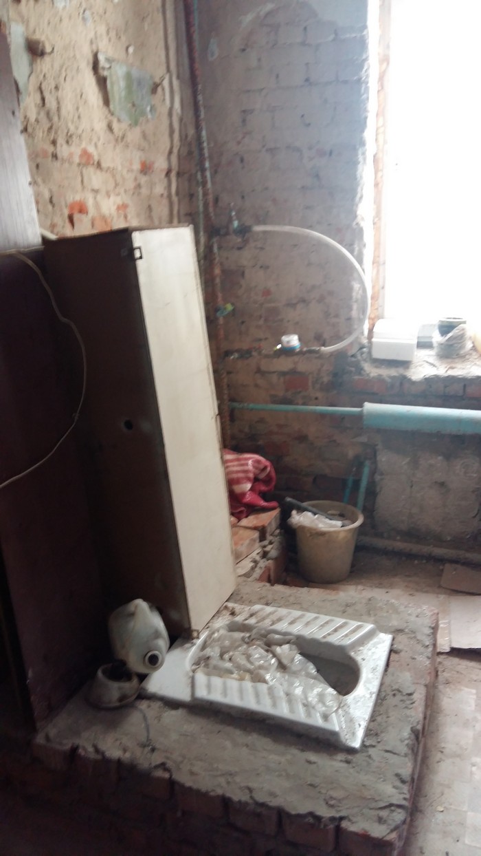 Душевая при ближайшем рассмотрении представляет собой полностью разбитое помещение, правда, в нем есть новый, установленный директором предприятия Алексеем Комовым работающий бройлер. Самое удивительное, что жильцы принимают здесь душ, ведь больше делать это негде.