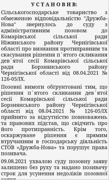 До того ж у реєстрі судових рішень зареєстровано позов, яким СТОВ «Дружба Нова» оскаржує в Чернігівському окружному адміністративному суді рішення сесії сільради. Цим рішенням депутати заборонили будівництво на території громади вузла з виробництва хімічних добрив КАС. Сільська рада, а точніше сільський голова Віктор Бондаренко, знаючи про судовий позов агрохолдингу, не подав зустрічного позову до суду.