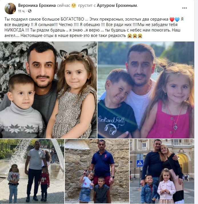 "Ты подарил самое большое БОГАТСТВО … Этих прекрасных, золотых два сердечка ❤️💙 Я все выдержу !! Я сильная!!! Честно !!!! Я обещаю !!! Все ради них !!!!Мы не забудем тебя НИКОГДА !!! Ты рядом будешь .. я знаю ..я верю … ты будешь с небес нам помогать. Наш ангел…. Настоящие отцы в наше время-это все таки редкость", - написала на своїй сторінці у Фейсбуку дружина Артура Єрохіна.