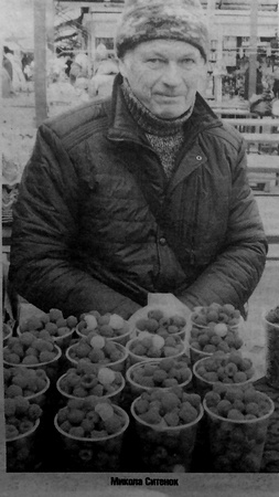 Малину зі свого городу 68-річний Микола Ситенюк з села Халявин Чернігівського району продає в Чернігові на базарі по 30 гривень за пластиковий стаканчик. Він стандартний, малини влазить десь грамів 250. Червона, рожева, трохи жовтої.