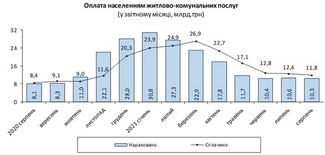 Госстат сообщил, что августе 2021 года население оплатило коммунальных услуг на 11,8 млрд грн. Накануне нового отопительного сезона люди стараются выплатить задолженности, которые накопили в старом.