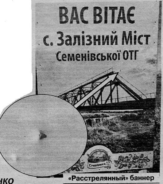 В 1 км от Зализного Моста на Семеновщине — железнодорожный мост через реку Ревна, который и дал название селу. Он изображен на больших баннерах (до 2-х метров в высоту и до 1 метра в ширину), установленных на обоих въездах — со стороны Семеновки и Галагановки. Несколько дней назад «семеновский»... неизвестные расстреляли: вмятины от пуль травматического оружия остались внизу и по бокам. Наглость стрелков возмутила местных жителей (всего в селе проживает 180 человек).