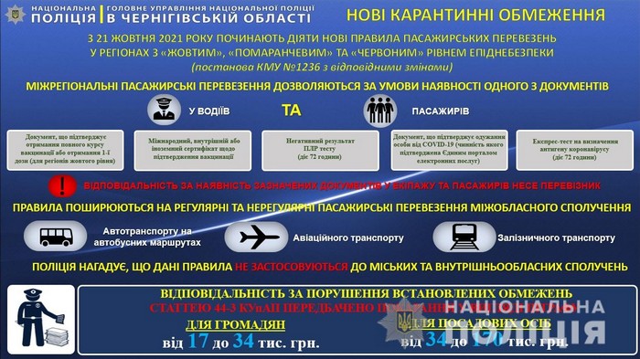 Уряд затвердив нові правила пасажирських перевезень на час карантину. З 21 жовтня міжрегіональні перевезення пасажирів у регіонах із «жовтим», «помаранчевим» або «червоним» рівнем епіднебезпеки будуть дозволені за умови наявності у всіх водіїв, працівників авіа і залізничного транспорту та пасажирів одного із цих документів: