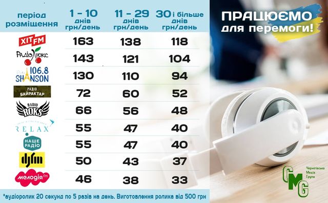 Головним і найавторитетнішим гравцем на ринку радіореклами у нашому місті є Чернігівська Медіа Група. На сьогодні ця компанія ексклюзивно представляє найбільший і найкращий пул FM-радіостанцій, який охоплює близько 70 % всієї слухацької аудиторії міста Чернігів. Це 9 топових радіо – лідерів як у своїх тематичних сегментах, так і у всеукраїнських рейтингах загалом: