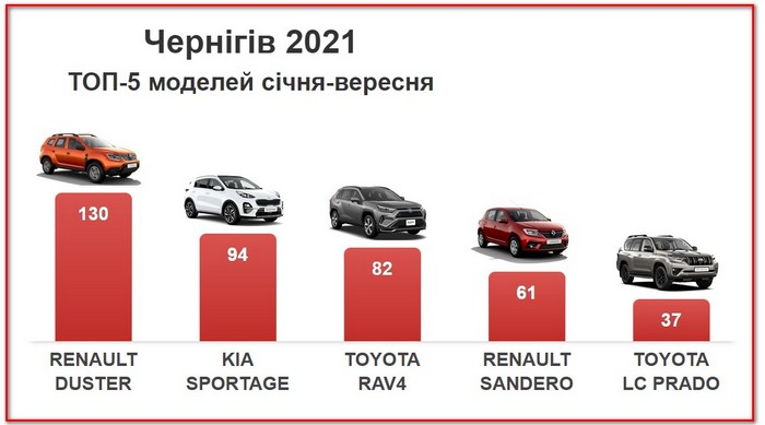Впродовж трьох кварталів 2021 року в Чернігові та області зареєстрували 1 260 нових автомобілів. На покупку цих авто витратили 34 млн доларів, а найпопулярнішою моделлю був кросовер Renault Duster.