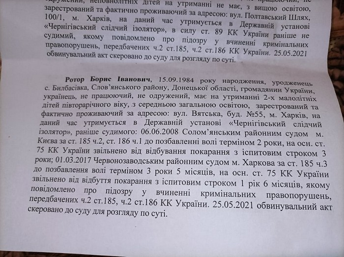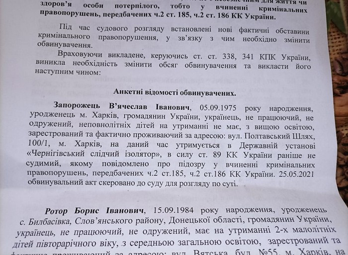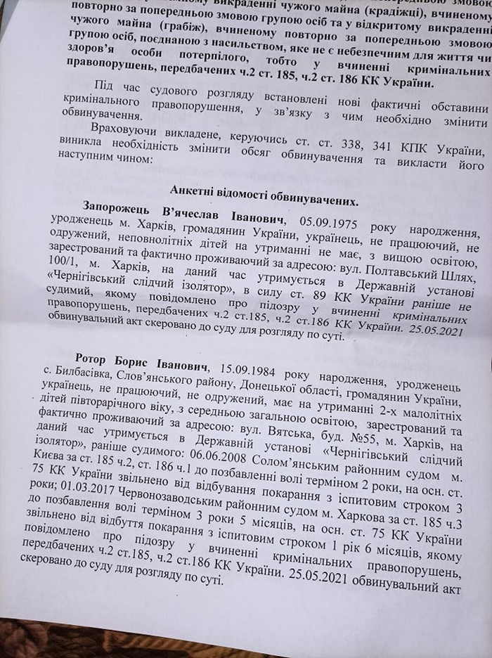 У судовому засіданні обвинувачений з Донеччини (Ротор Борис Іванович) раніше два рази судимий за грабіж та крадіжки свою вину у вчиненні кримінальних правопорушень, передбачених ч.2 ст.185 (крадіжка), ч.2 ст.186 (грабіж) КК України визнав частково, погодився що крадіжка мала місце, але не грабіж, бо силу вони не застосували, а викрадали прикраси таємно.