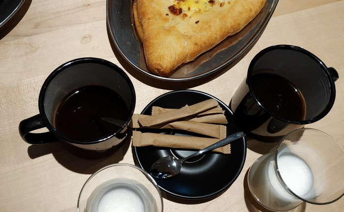 Ну и в заключение, нам подали Американо в черных металлических кружках и отдельно молоко в стеклянных стаканчиках. Кофе был нежным по вкусу с лёгким ореховым оттенком. Мы уточнили – его готовят из зерен колумбийской арабики.