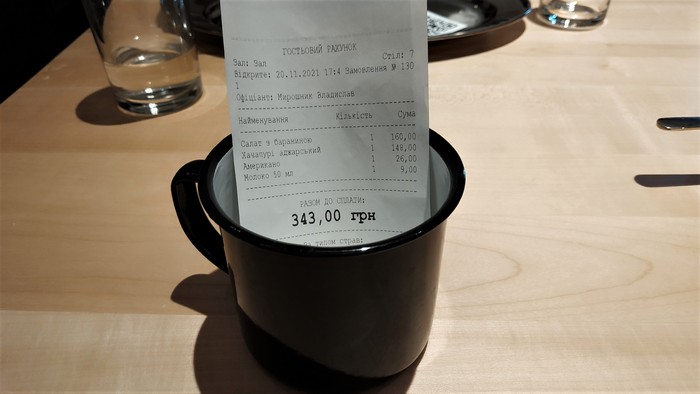 Итого, общий чек получился на сумму 343 гривны. Здесь гораздо выгоднее заказывать блюда на двоих или более человек.