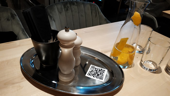 Встретил нас и провел к столику официант по имени Владислав. Меню в бумажном виде пока нет. Поэтому, он предложил воспользоваться распечатанным QR-кодом (он есть на каждом столе), который нужно отсканировать в своем смартфоне, затем на сайте бистро открыть меню и выбрать что-то себе по вкусу. Соответственно, если у вас разрядился смартфон или вы его попросту не взяли с собой, блюда придется выбирать с помощью официанта.