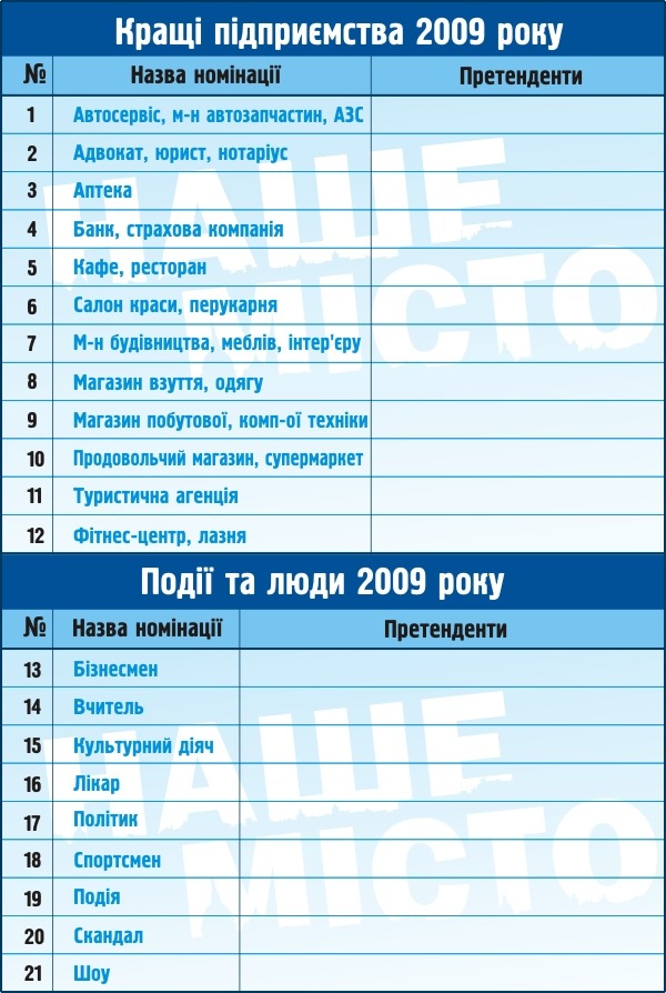 Пропонуємо вам взяти участь в акції «Наше місто» та назвати найкращі, на вашу думку, особистості, підприємства та визначні події року.