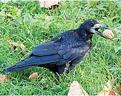 Ворона нашла грецкий орех и бросала его с высоты под колеса автомобилей для того, чтобы те раздавили неподатливую скорлупу.