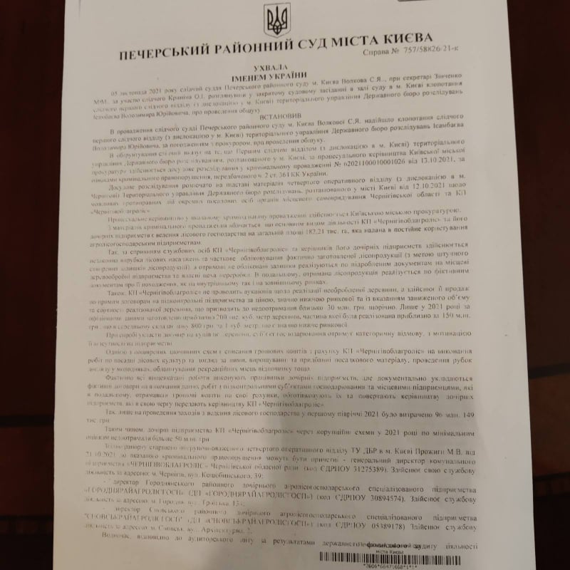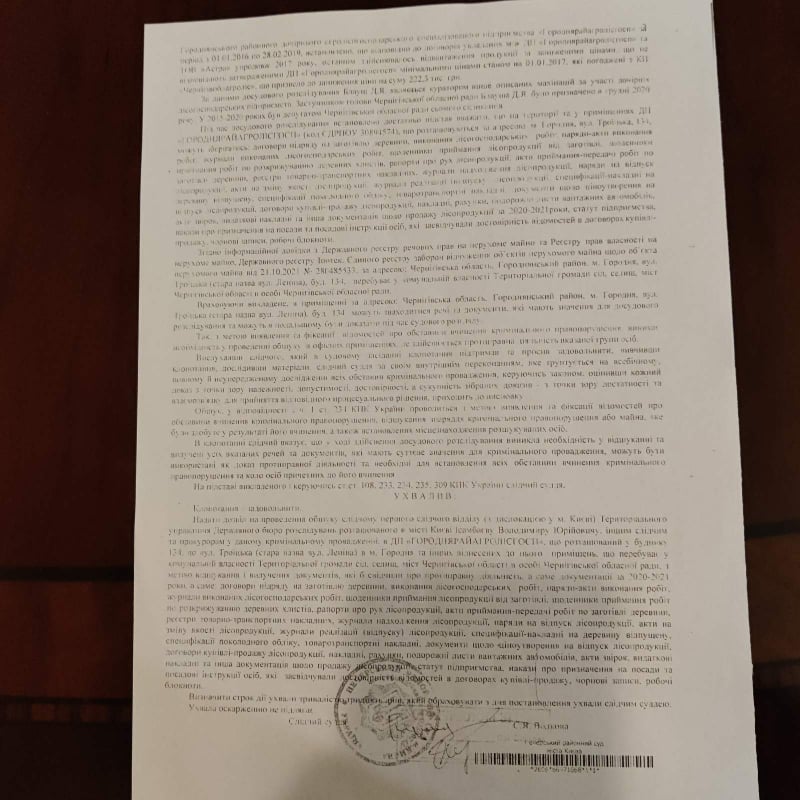 Не дивлячись на те, що світлини ухвали дуже поганої якості, нам вдалося розібрати, що в документі мова йде про клопотання слідчого ДБР надати дозвіл на обшук у Городнянському районному дочірньому агролісогоподарському спеціалізованому підприємстві "ГОРОДНЯРАЙАГРОЛІСГОСП", яке розташовано за адресою м.Городня, вул.Троїцька, 134.
