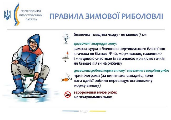 Чернігівський рибоохоронний патруль попереджає рибалок - любителів, що виходити на лід можна лише при його товщині не менше, як 7 см, групу людей витримає лід товщиною в 15 см, автомобіль – не менше 30 см.