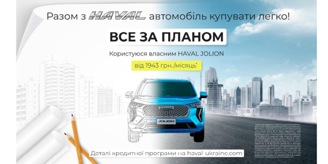 Інший варіант фінансування HAVAL Finance Fixed Rate та комфортні умови кредитування – 0,01% річних при авансовому платежі в розмірі 70% від вартості автомобіля та періоді кредитування 7 років дозволяють стати власником сучасного автомобіля із мінімальними щомісячними кредитними виплатами. Наприклад, здійснивши авансовий платіж у розмірі 70%, Ви користуватиметесь власним H6 нового покоління від 2 528 грн. на місяць!*** В той час користування HAVAL JOLION в кредит коштуватиме від 1 943 грн. на місяць!****
