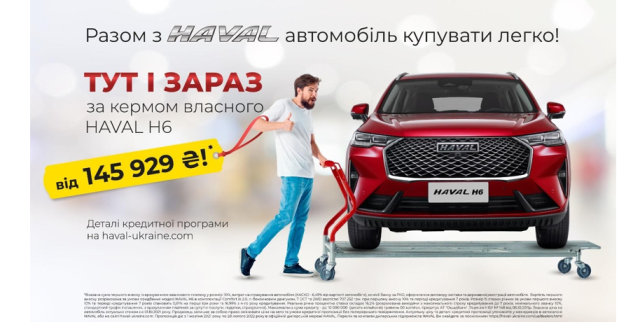 ***Вказана сума кредитного платежу в місяць за умови купівлі автомобіля HAVAL Н6 в комплектації Comfort з 2.0 л. бензиновим двигуном, 7DCT та 2WD, вартістю 707 252 грн. при першому внеску 70% та періоді кредитування 7 років. Розмір % ставки річних за умови першого внеску 70% та періоді кредитування 7 років становить 0,01%. Реальна річна процентна ставка складає 41,2% (розрахована виходячи з максимального строку кредитування до 7 років, авансу 70 %, стандартний графік погашення, з врахуванням платежів за супутні послуги, податки, страхування). Максимальна сума кредиту - до 10 000 000 (десять мільйонів) гривень 00 копійок, мінімальний аванс від 10%. Кредитує АТ "Ощадбанк" Ліцензія НБУ № 148 від 05.10.2011р.