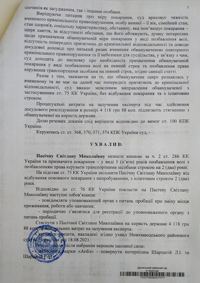 Главным обстоятельством, смягчающим наказание, признал искреннее раскаяние обвиняемой, и вместо 5 лет лишения свободы с лишением права управлять транспортными средствами на 2 года, освободил Пасечную от основного наказания с испытательным сроком 2 года: «На підставі ст.75 КК України звільнити Пасічну Світлану Миколаївну від відбування основного покарання з випробуванням, з іспитовим строком 2 (два) роки».