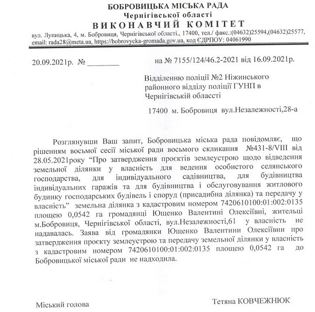 Відповідь надала тоді ще голова громади Тетяна Ковчежнюк: «…рішенням восьмої сесії міської ради восьмого скликання №431-8/VІІІ від 28.05.2021 року «Про затвердження проектів землеустрою щодо відведення земельної ділянки у власність для ведення особистого селянського господарства, для індивідуального садівництва, для будівництва гаражів….» земельна ділянка, площею 0,0542 га громадянці Валентині Ю. у власність не надавалася. Заяви від громадянки … про затвердження проекту землеустрою та передачі у власність земельної ділянки не надходило».
