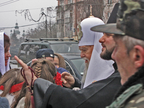 Его встретили верующие, выстроившиеся живым коридором вдоль аллеи до храма. Раздавались приветственные возгласы, путь Патриарха усыпан лепестками цветов. У стен храма выстроились протестующие с лозунгами и плакатами. Раздаются выкрики: «Наш Патриарх Кирилл!».
