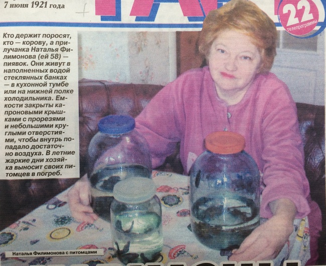 Кто держит поросят, кто — корову, а прилучанка Наталья Филимонова (ей 58) — пиявок. Они живут в наполненных водой стеклянных банках — в кухонной тумбе или на нижней полке холодильника. Емкости закрыты капроновыми крышками с прорезями и небольшими круглыми отверстиями, чтобы внутрь попадало достаточно воздуха. В летние жаркие дни хозяйка выносит своих питомцев в погреб.
