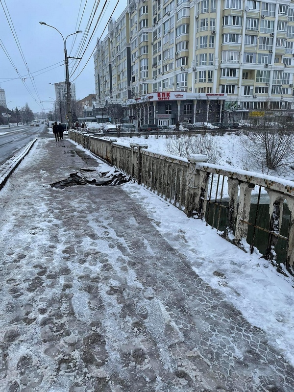 Зранку до Управління ЖКГ Чернігівської міської ради надійшло повідомлення про пошкодження пішохідної частини мосту через річку Стрижень по Проспекту Перемоги. Сталося це під час чищення та посипання тротуару.