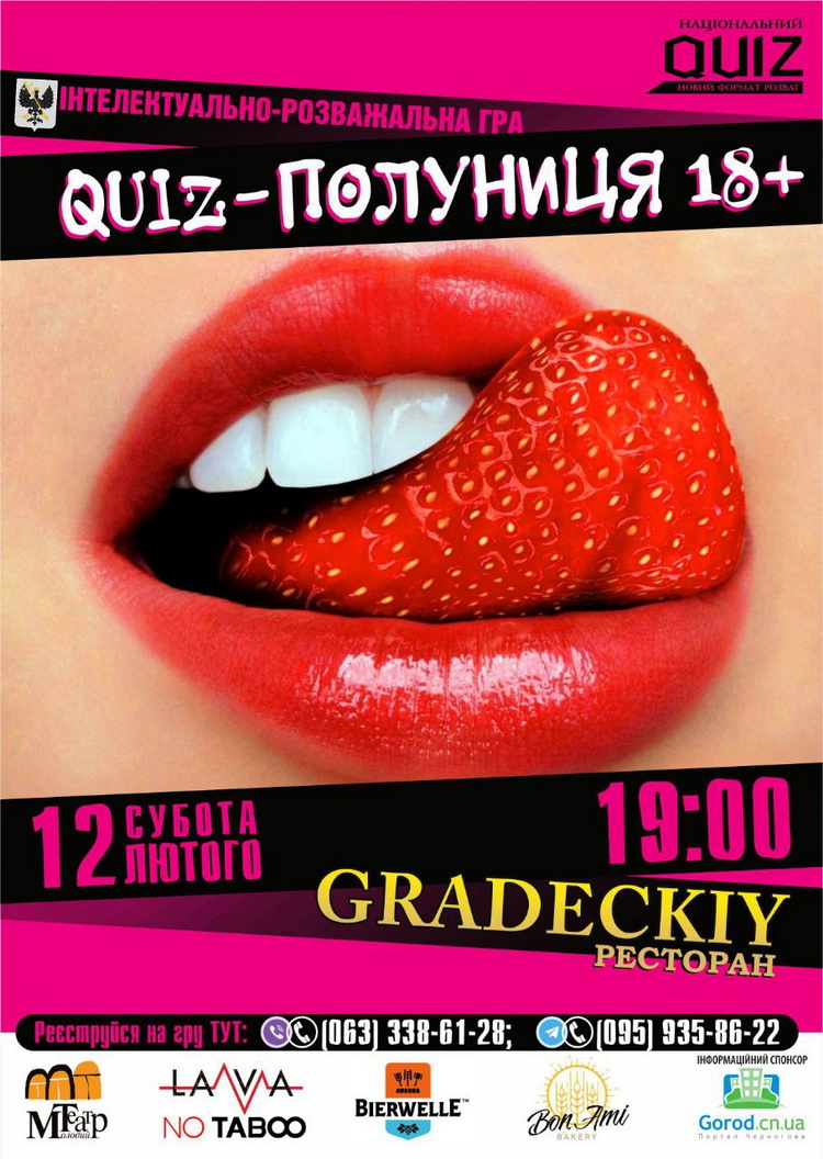 ЦІКАВО 12 лютого в суботу в закладі GRADECKIY відбудеться тематична гра QUIZ-ПОЛУНИЦЯ 18+ від проєкту Національний QUIZ в м.Чернігів! Ще більше цікавих запитань, нові ідеї та натхнення, а також купа подарунків від спонсорів! Все це і не тільки чекає на вас наступної гри!