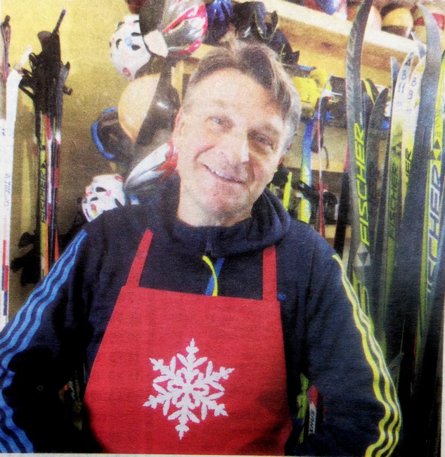 В красном фартуке 53-летний Николай Ворчак, заслуженный тренер Украины по лыжным гонкам, в холле спортивной базы клеит лыжи.