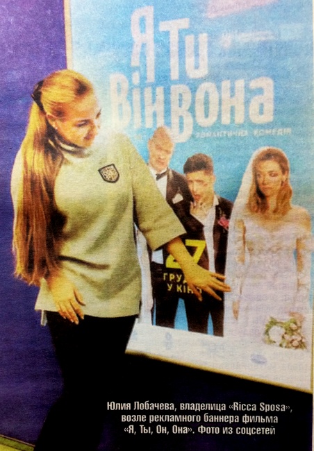 «Если платье порвали, значит, свадьба удалась», — смеется Юлия Лобачева, руководитель и основатель торговой марки «Ricca Sposa» (в переводе с итальянского означает «богатая невеста»). Свадебное платье из коллекции бренда «Ricca Sposa» появилось в рекламе, а затем и в фильме от «Квартала 95» «Я, Ты, Он, Она», который показали во всех кинотеатрах страны. В главных ролях — комики Владимир Зеленский и Евгений Кошевой, певица Надя Дорофеева и актриса Настя Короткая. Настя и надела то самое платье. О свадебной моде поговорили с Юлией Лобачевой после премьеры.