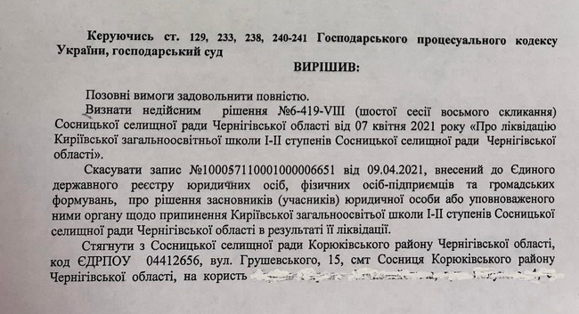 Господарський суд Чернігівської області у складі головуючого судді Юрія Федоренка скасував рішення Сосницької селищної ради від 7-го квітня 2021 року «Про ліквідацію Киріївської загальноосвітньої школи І-ІІ ступенів Сосницької селищної ради Корюківського району». І доки Сосницька селищна рада готує апеляцію, правозахисниця впевнена у своїй перемозі. Оксана Мірошниченко переконана, що це рішення – історичне і таке, що дасть поштовх для подальшого розвитку села.