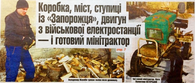 — Я працюю сторожем у школі, дружина там же помічником кухаря. Маємо 4,5 гектара землі (для ведення особистого селянського господарства). Щоб обробляти, потрібна техніка. От і мізкував, як з найменшими витратами змайструвати трактор самому. Деякі ідеї підгледів в інтернеті, — веде мене двором Желябін. — Ось саморобна бетономішалка. З бочки її зробив, мотор поставив. Це картоплесаджалка, — показує на залізяччя, що стирчить з-під снігу. — А ось мінітрактор самокльоп. Із «Запорожця» взяв міст, коробку, стулиці, купив двигун із воєнної електростанції . Каркас зварив з металу. Правда, трактор не такий красивий, як в інтернеті продають. Та для мене головне не краса, а функціональність. На посадку десяти соток картоплі мій тракторець бере десь два літри бензину.