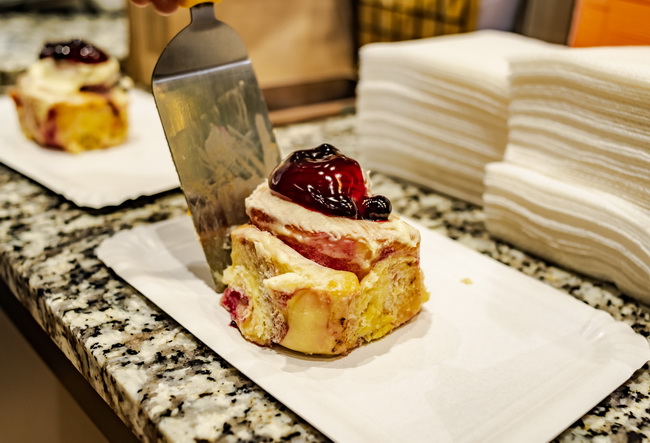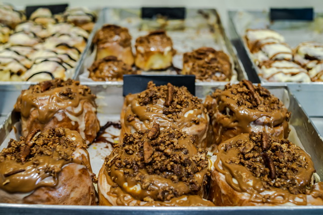 Готують булочки прямо на ваших очах: симпатичні пекарі формують роли з начинками та випікають. Потім булочки змащують смачною глазур'ю, і тільки тоді вони потрапляють до вітрини. Скуштувати можна прямо на місці або в красивій упаковці забрати з собою.