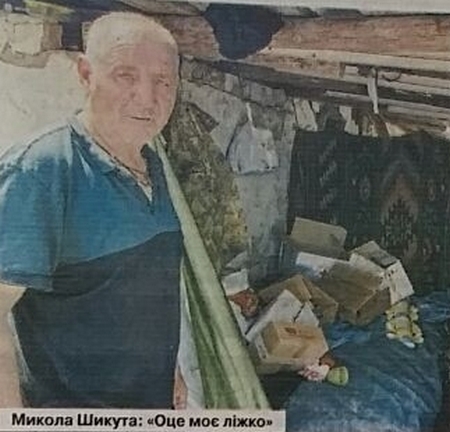 Поряд із погребом, уже зараз, пан Микола обладнав собі накриття. Тут і живе! Стареньке, посічене осколками від снарядів агроволокно тепер служить йому дверима. На збитому з дощок імпровізованому лежаку він обладнав собі ліжко: «Ночі вже не такі холодні, тому сплю тут. А що ж робити, посадив город, то за ним треба доглядати».