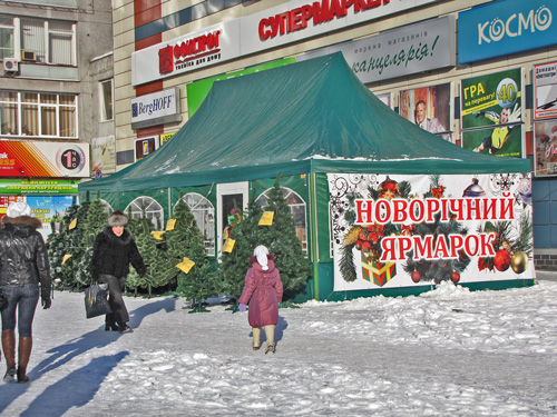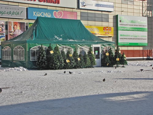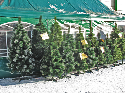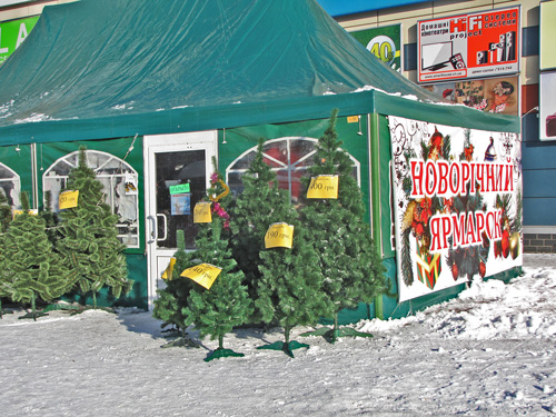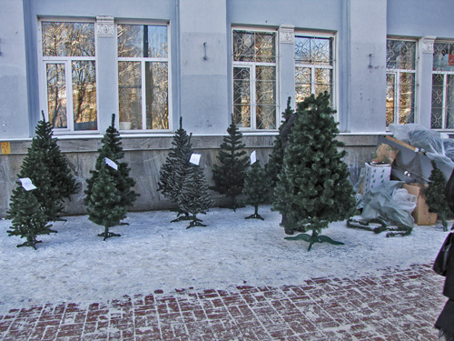 Возле главпочтамта торгуют искусственными елями и соснами Черниговского производства. Цены такие же, как и возле Мегацентра.