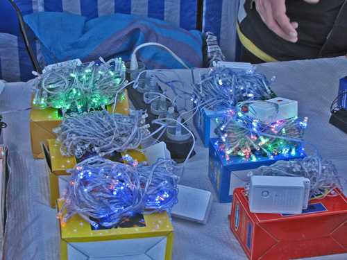 В отдельной палатке, продавец Олег торгует гирляндами. В основном китайского производства, все имеют 8 режимов работы, длина 5 метров. Цены от 10 и до 70 грн.