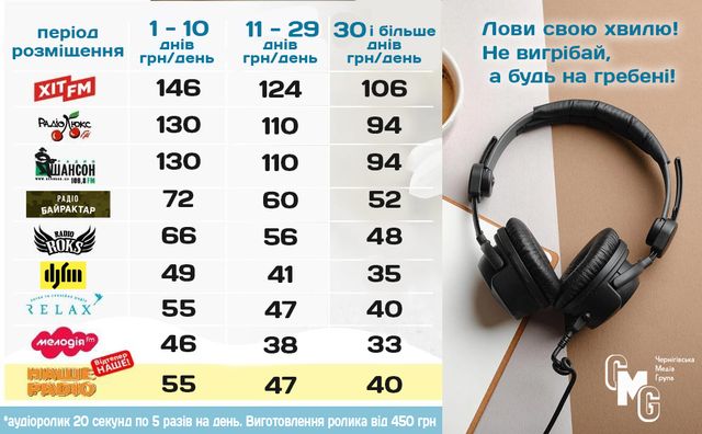 Ми з радістю допоможемо вам обрати потрібні станції для вашої реклами, зробимо класний аудіоролик і розмістимо в ефірі, проконсультуємо, підберемо кращі умови, домовимось!