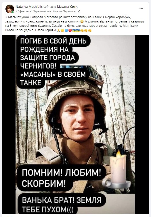 Чернігівська журналістка Наталія Мачюліс, будинок якої стоїть навпроти будівлі «Магр-Авто», розповіла що на Масанах тоді стояли декілька танків. Той танк, в якому загинув Іван Коваль базувався як раз під автоцентром. Вона розповіла, що 27-го лютого, коли росіяни влучили у танк, де були 25-річний навідник Іван Коваль, 24-річний старший лейтенант командир танку Максим Білоконь (Сумщина, м.Ромни) та 33-річний молодший сержант механік водій танкового екіпажу Дмитро Каплін (Полтавщина, с.Ковалівка) екіпаж загинув, а уламок від снаряду попав у квартиру на 8-му поверсі, яка через це повністю вигоріла. Власники квартири в цей момент у ній не перебували.