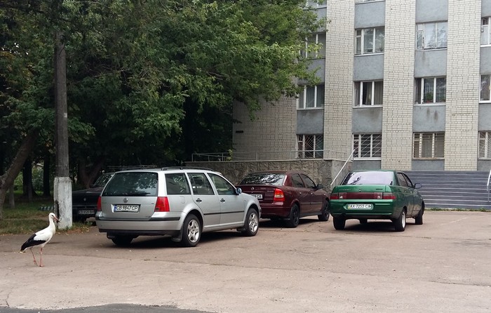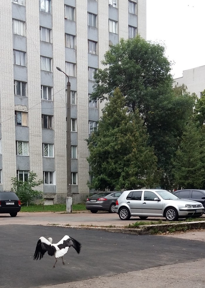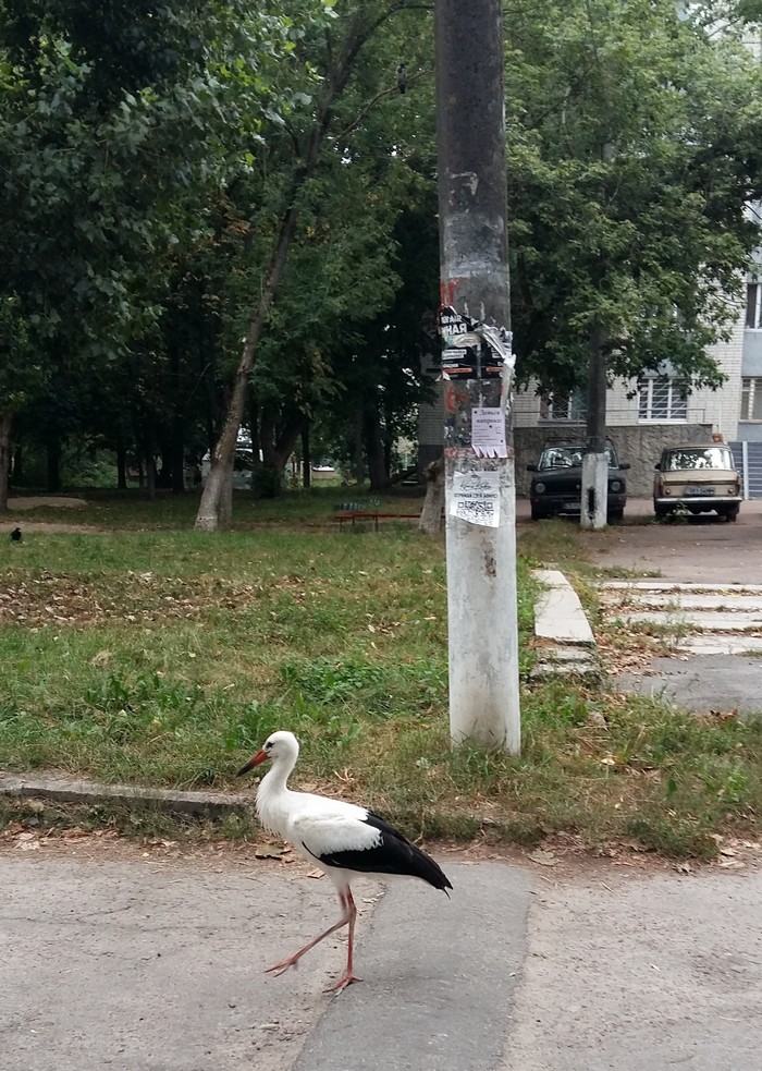 Дорогою на пляж сталася затримка на кілька хвилин через надзвичайну картину. Біля гуртожитку педуніверситету прогулювався ... лелека. Він підійшов до сходів будівлі, ніби збирався піднятися по них, але передумав, граційно зупинився, пішов назад. Зайшовши в дрібну калюжу, щось виловлював у ній, клацаючи дзьобом. Люди, що проходили повз, зупинялися близько до нього, на що він не звертав жодної уваги.